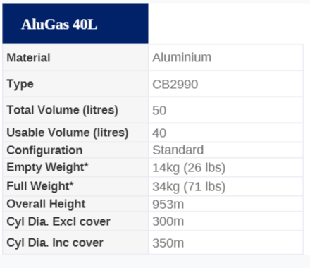 Le cylindre Alugas 40L en aluminium léger est conçue spécifiquement pour la montgolfière. Il a un volume utile de 40 L et pèse environ 13 kg à vide, il convient aux besoins opérationnels et aux différentes tailles de nacelles.
