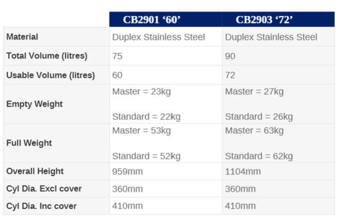 Les cylindres inox Duplex sont disponibles dans deux modèles de capacités utiles de 60 litres à 72 litres pour convenir aux besoins opérationnels et aux différentes tailles de nacelles. L’équipement avec maîtres-cylindres est disponible en option.