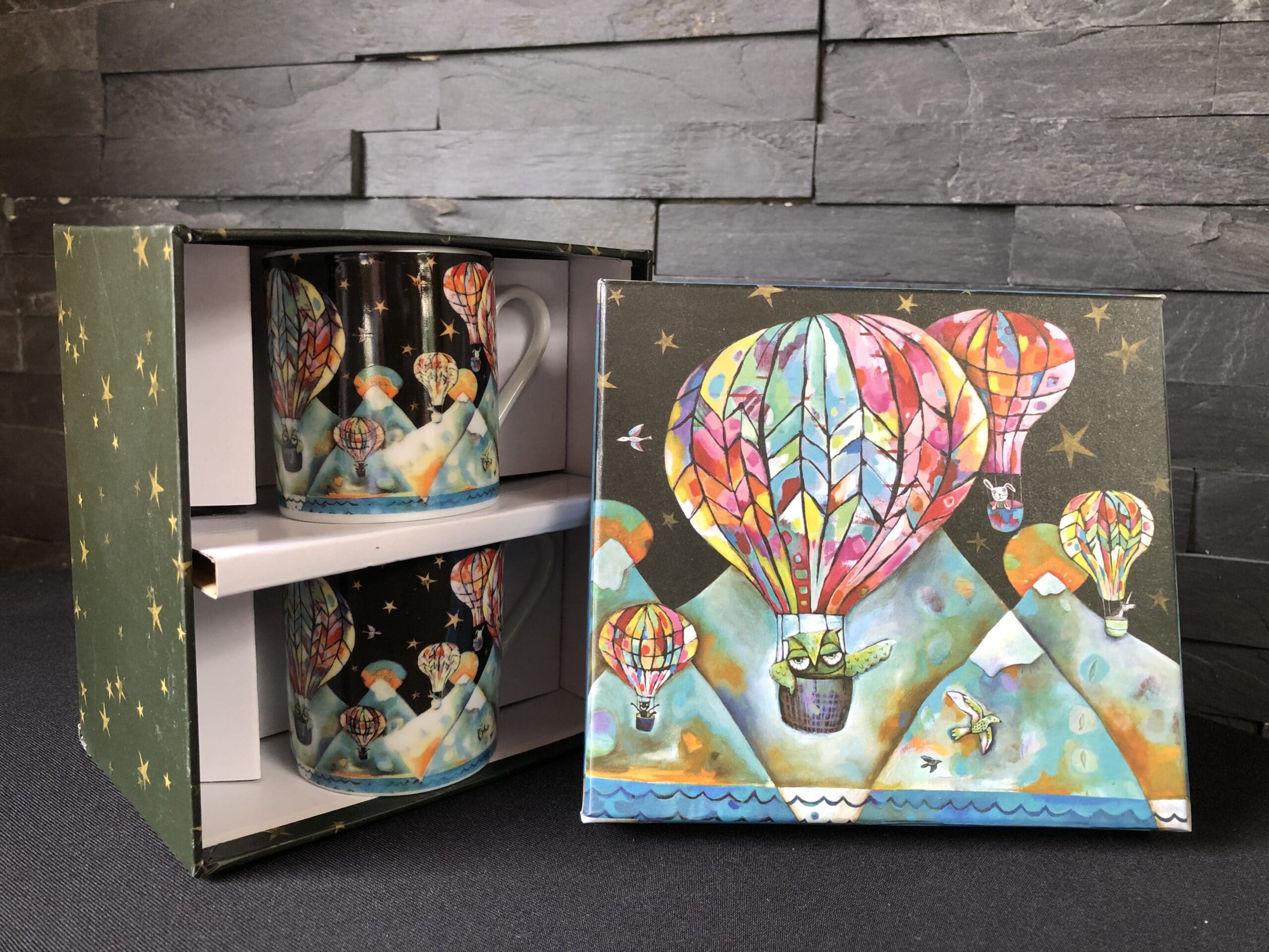 Set de 2 tasses à café au motif « montgolfières », avec leurs 2 soucoupes et leur boite